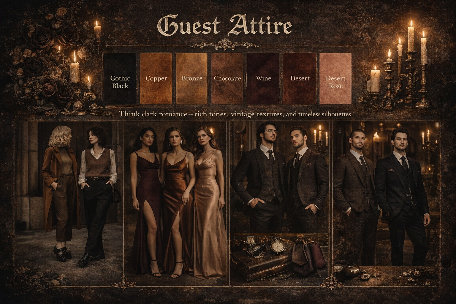 Our wedding embraces a romantic gothic aesthetic—think dark academia elegance, perfectly suited to the fall season and candlelit warmth. We invite you to dress in a way that feels refined, expressive, and fitting for an evening of moody celebration. Please refrain from wearing green, as it is reserved for the bride and groom.
